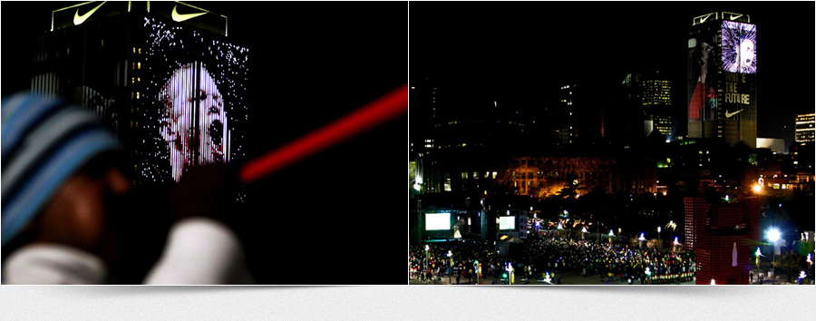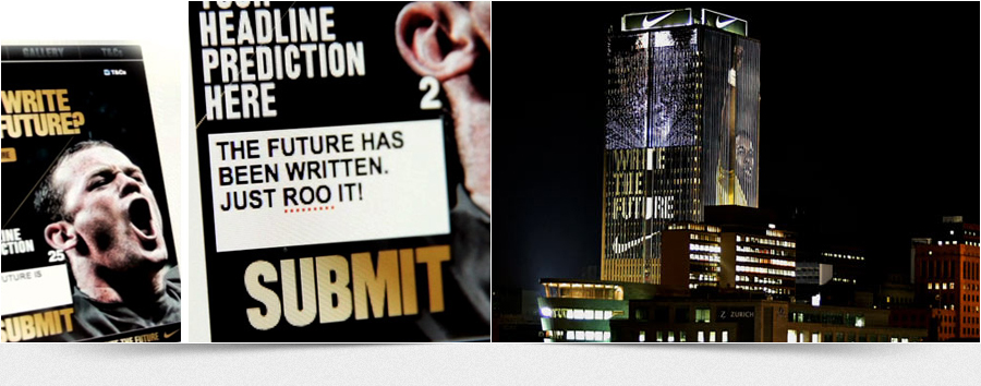 Nike’s Write The Future Massive LED Screen June 25, 2010 in Campaigns & Commercials 3 Comments As part of its ‘Write the Future’ campaign, Nike has taken over Johannesburg’s Southern Life Center building for an interactive LED light show. ‘Write the Headline” allows fans around the world to root for their favourite World Cup player in a big way. The installation, almost the size of half a football pitch, displays submissions from Facebook (facebook.com/nikefuture), Twitter (#nikefuture), QQ (a Chinese chat program), and Mxit (a South African IM app) that can be read from distances as far as 2.5 kilometers away! Users vote on the player they think will ‘write the future.’ Personal messages are then projected on the city’s fourth largest building. The screen uses over 6,000 Daktronics ProPixel sticks and is 40m wide by 44m high. Via: DailyDOOH #nikefuture cristiano ronaldo building fans message massive screen johannesburg nike adverstising nike campaign nike facebook nike mxit nike personal message nike QQ nike screen nike soccer nike twitter nike write the future nikefootball tevez nike building write the future building write the future campaign write the future screen 2010-06-25 Stephane Share ! tweet